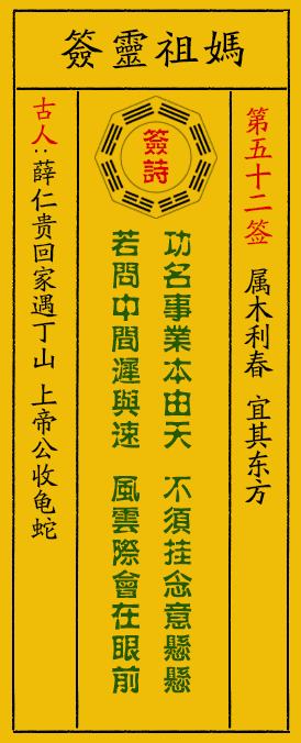 | 解曰 | 讨海:得财在三日过。 作塭:有大利。 鱼苗:此近日得大财。 求财:有大利。 耕作:有收成。 经商:万商云集。 月令:平平渐渐平安。 六甲:添之弄璋。 婚姻:谨成吉。 家运:贵人到处。 失物:速寻在。 寻人:渐回。 远信:音信立至。 六畜:平平有利。 筑室:可以平安。 移居:好。 坟墓:穴场允吉。 出外:行遇主公。 行舟:有利可得。 凡事:慢成大险。 治病:三日过贵人好。 作事:紧成迟者了钱。 功名:扬名在即。 官事:破财完局。 家事:家庭大吉。 求儿:不好有事。 |