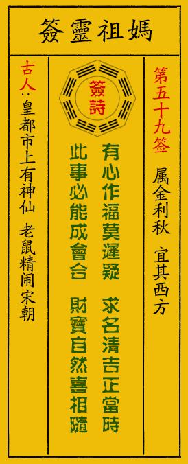 | 诗曰 | 有心作福莫迟疑、求名清吉正当时、此事必能成会合、财宝自然喜相随。 |
